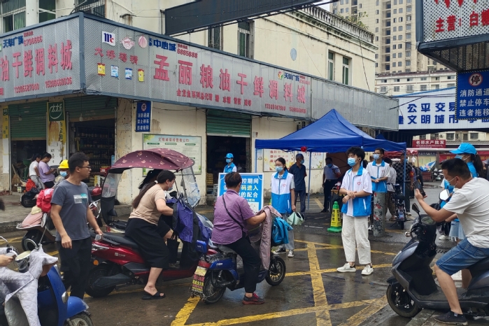 圖為溫司君同學在阜陽市冷寨社區菜市場路口進行測溫掃碼